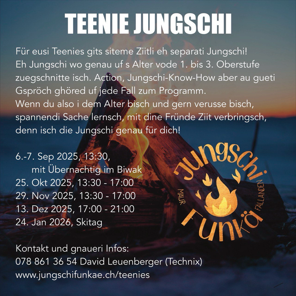 Du bist aus dem Jungschialter rausgewachsen und gehst in die 1. bis 3. Oberstufe? Dann haben wir genau für dich spannende actionreiche Momente bereit. Komm auch in die Teenie Jungschi und finde